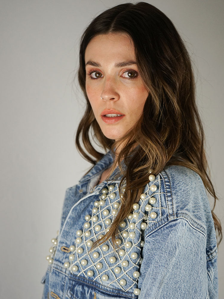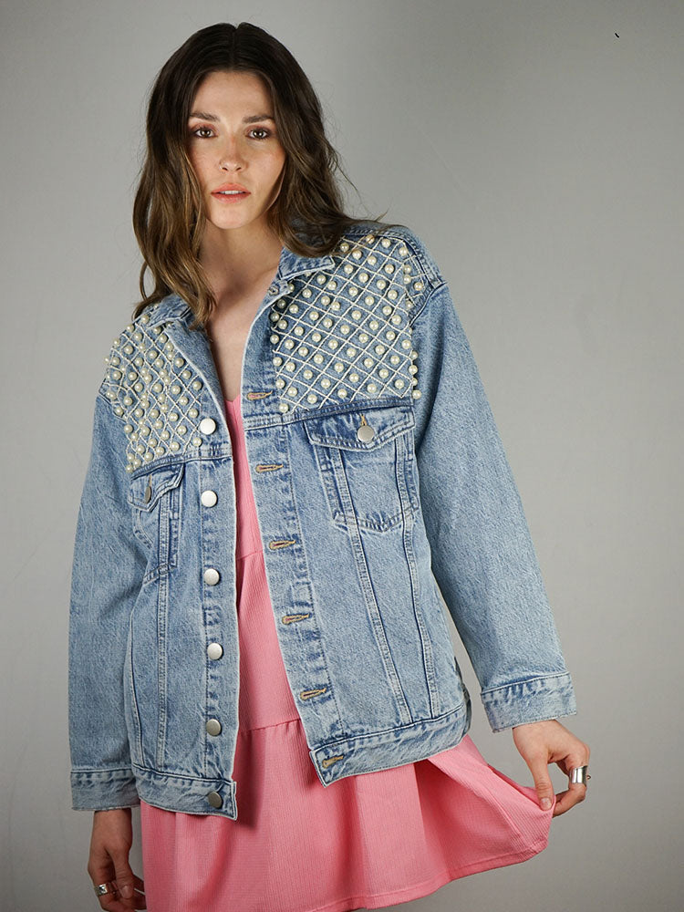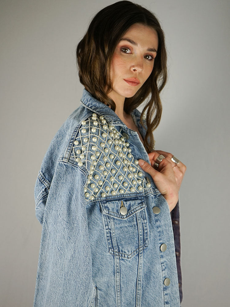 Introducing our Bejewelled denim jacket, embellished with lustrous pearls. Elevate your style effortlessly with the timeless charm of pearls, adding a dash of luxury to your everyday ensemble. Now only available in a new mid-blue wash.